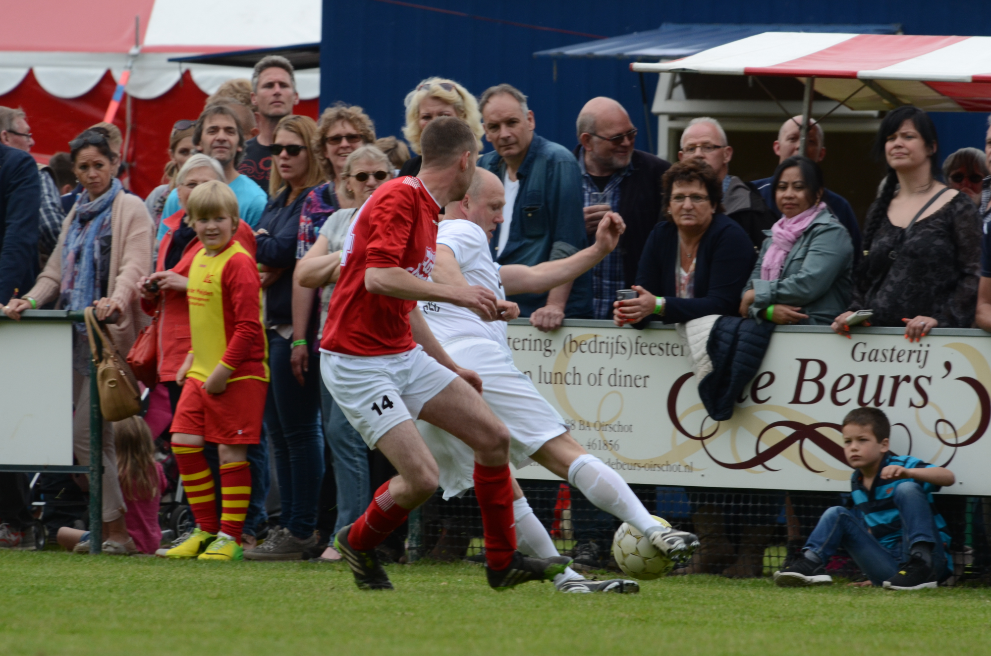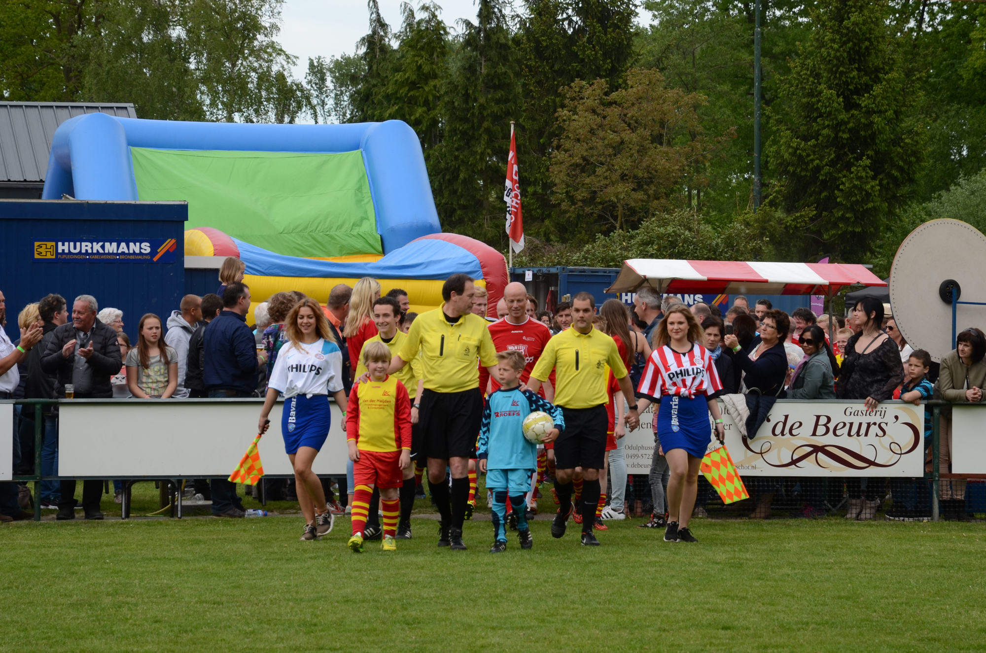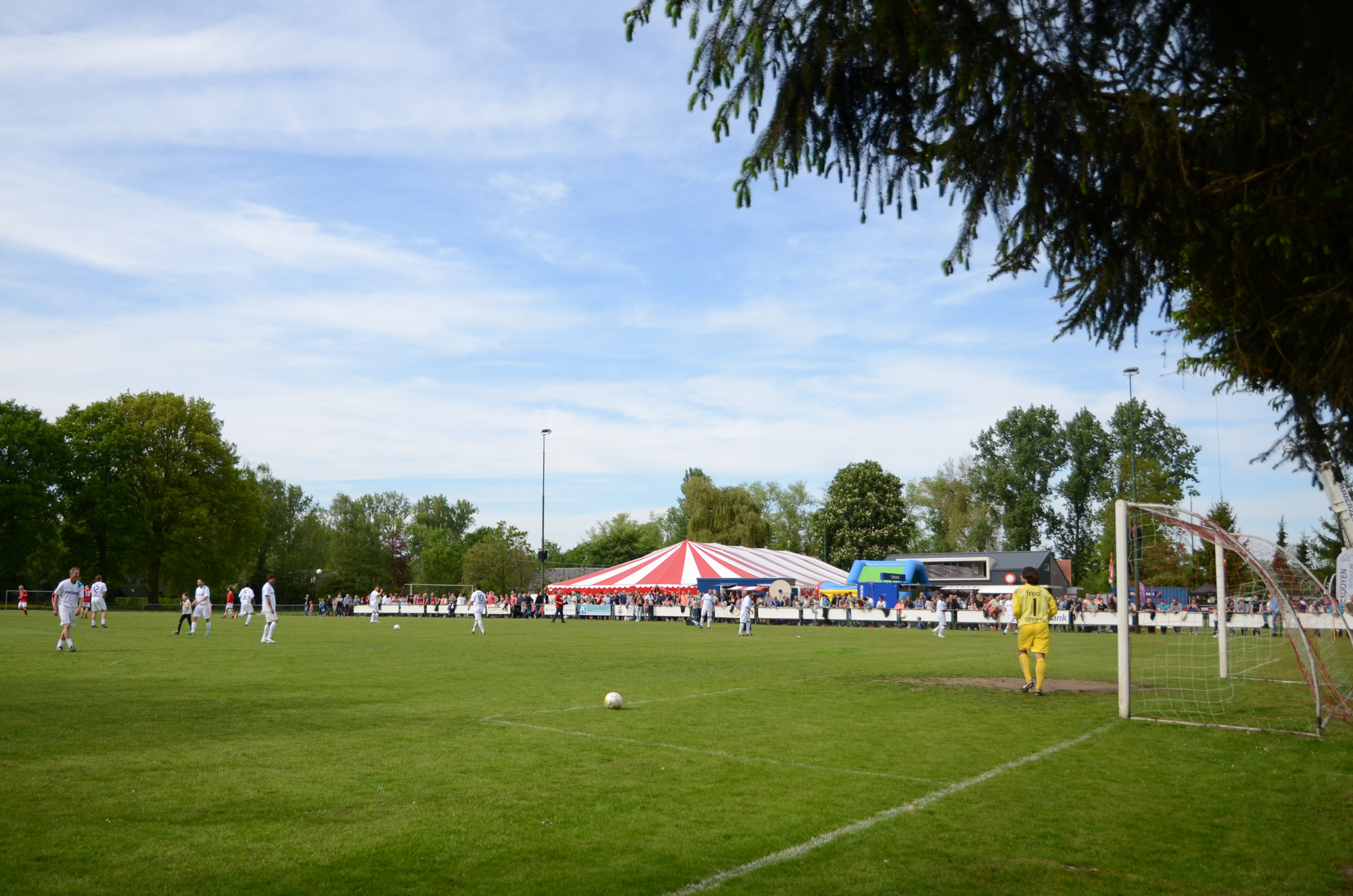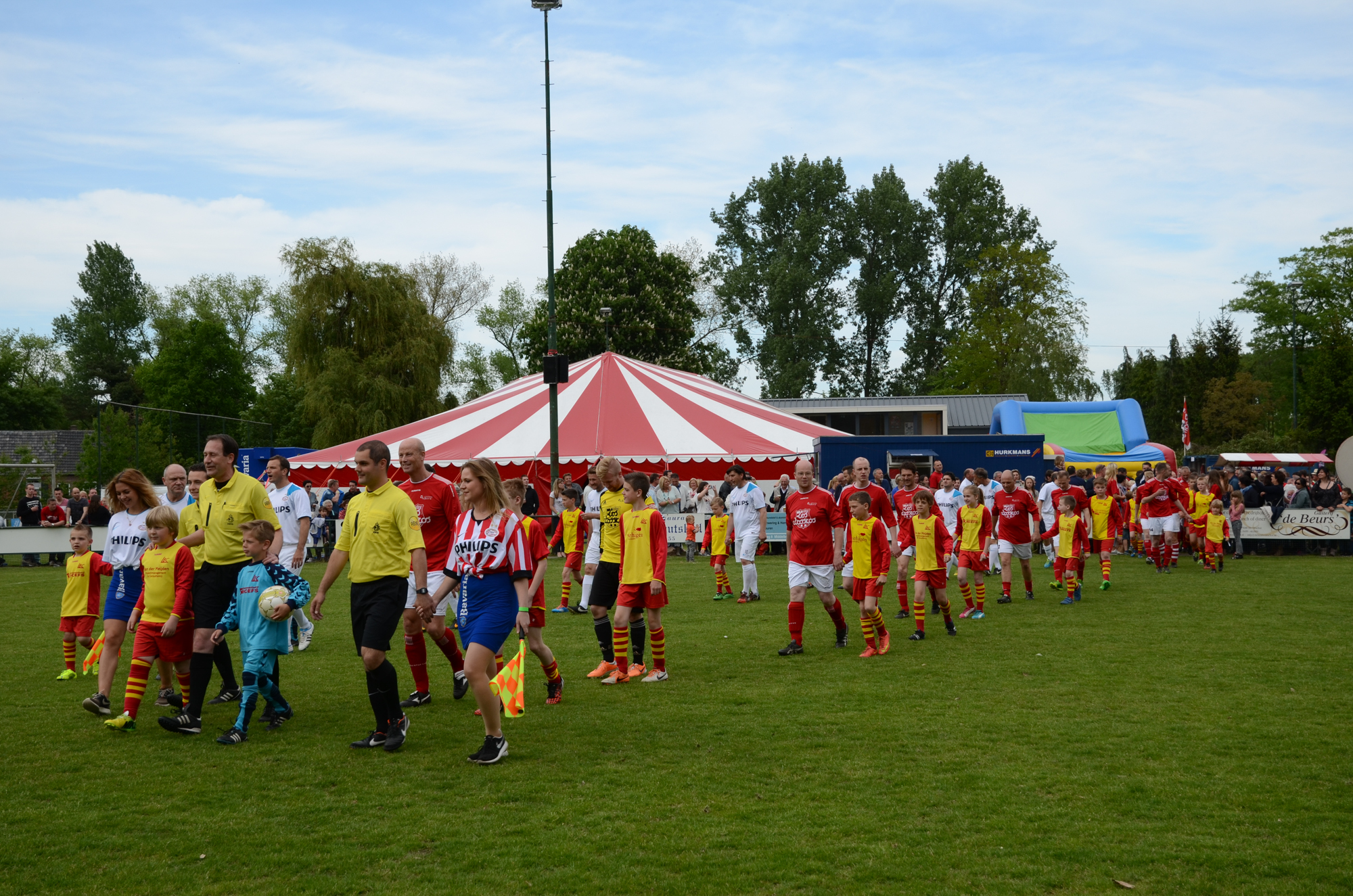 Hemelvaartsdag stond in het teken van De Bocht ’80 kent geen grenzen. En grensverleggend was het programma van deze dag. Op weg richting het sportpark wordt dat al snel duidelijk. Een helikopter vliegt af en aan richting het centrum van Oirschot. De landingsplaats is midden op het festival terrein en elke keer als het vliegmachine vertrekt is er veel bekijks. Een judo instructeur met zwarte band laat de technieken achter deze verdedigingssport zien. Een voetballer wordt in de houtgreep gelegd. Midden op het terrein wordt een mooie jongedame gebodypaint. Ook zij mag van geluk spreken dat het stralend mooi weer is. Af en toe valt er een bezoeker uit de 25 meter hoge bungee bak naar beneden. Het terrein wordt dan overstemd door een gegil. Ook bij de politie honden show is het volle bak. Een bandiet heeft het slecht als hij probeert te ontsnappen aan de viervoeter. Hij is niet snel genoeg en heeft de grote hond aan zijn mouw hangen. De hond laat niet meer los. De kinderen vermaken zich prima op één van de vele luchtkussens of in een ritje met de cross buggy. Er zijn zelfs enkele papa’s de mee willen rijden. Een trial rijder steelt de show als hij met zijn motor op het dak van een auto springt. De gehele middag is een man met ketting zaag prachtige sculpturen aan het zagen uit dikke boomstammen. Kortom, er was genoeg te zien en te beleven op het sportpark aan de oude grintweg. En voor wie niet van dit spektakel houdt was er sowieso nog de wedstrijd tegen Legendary PSV.