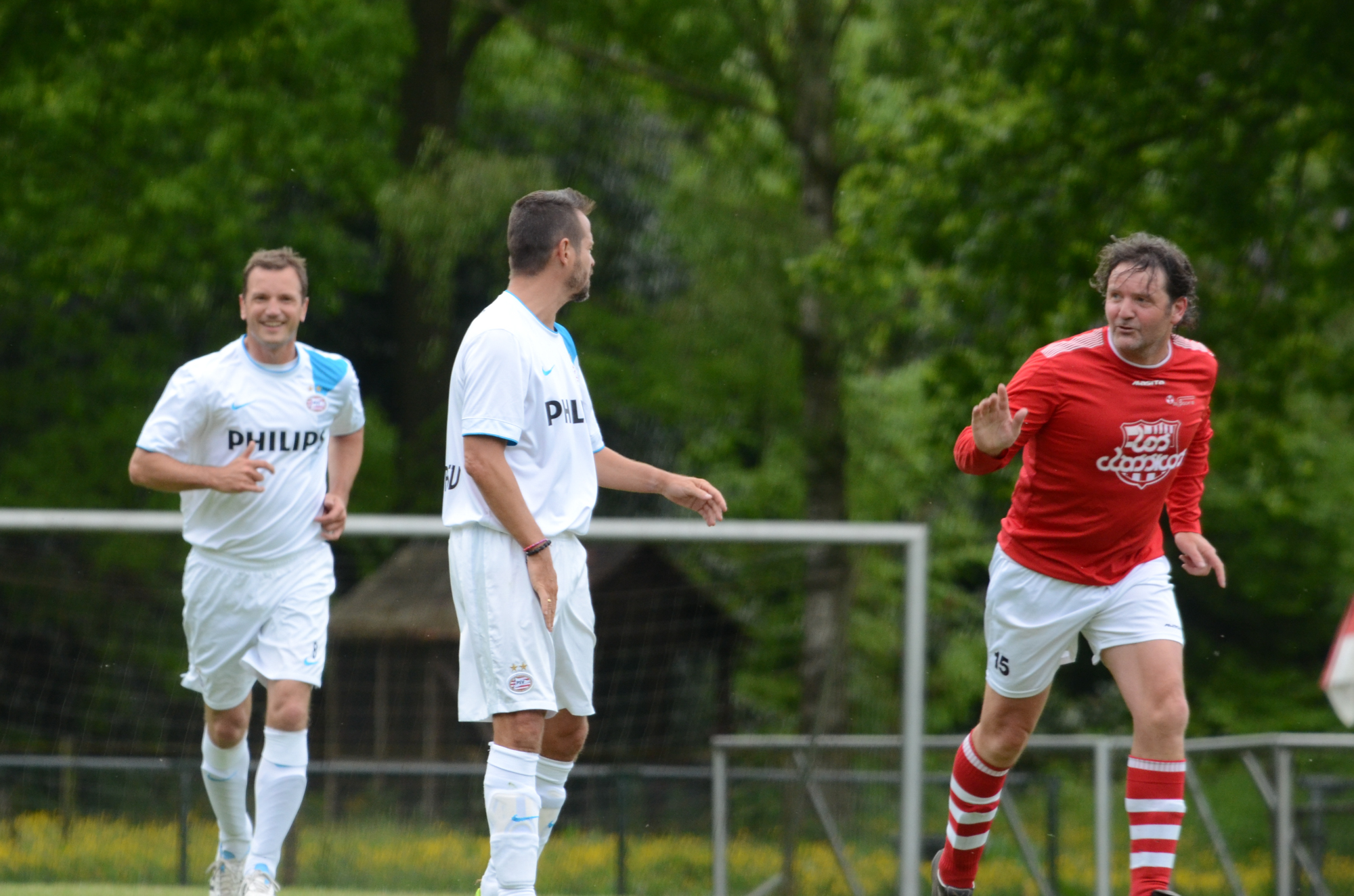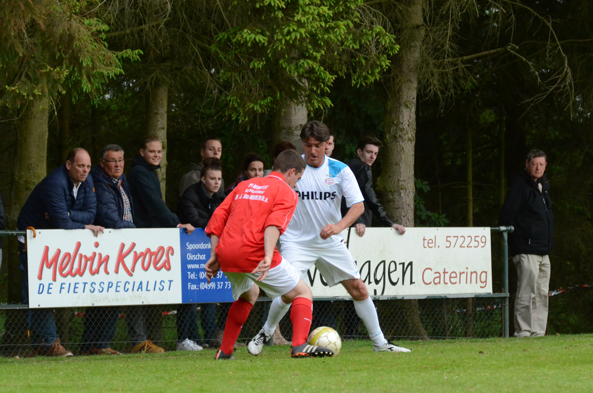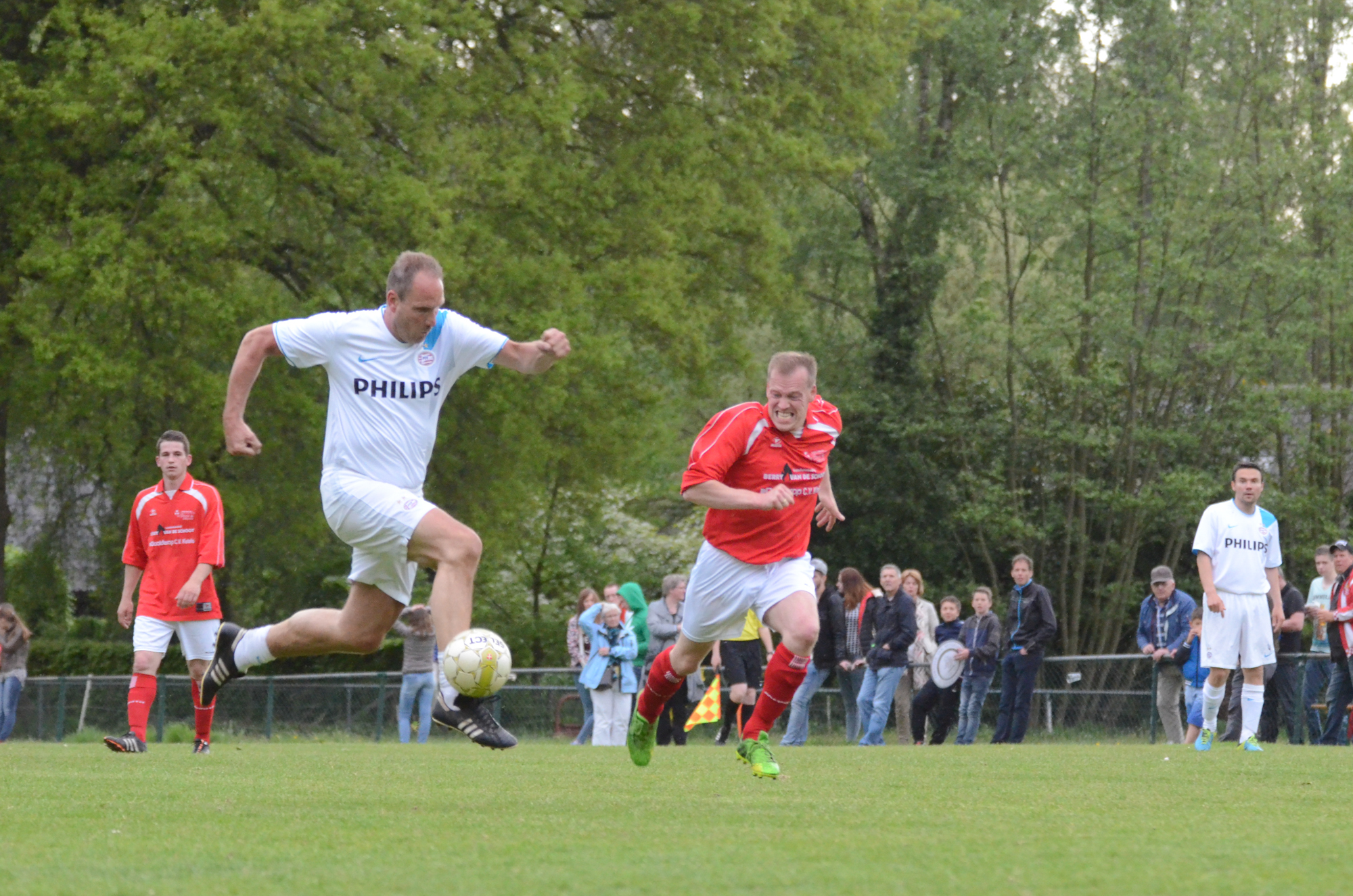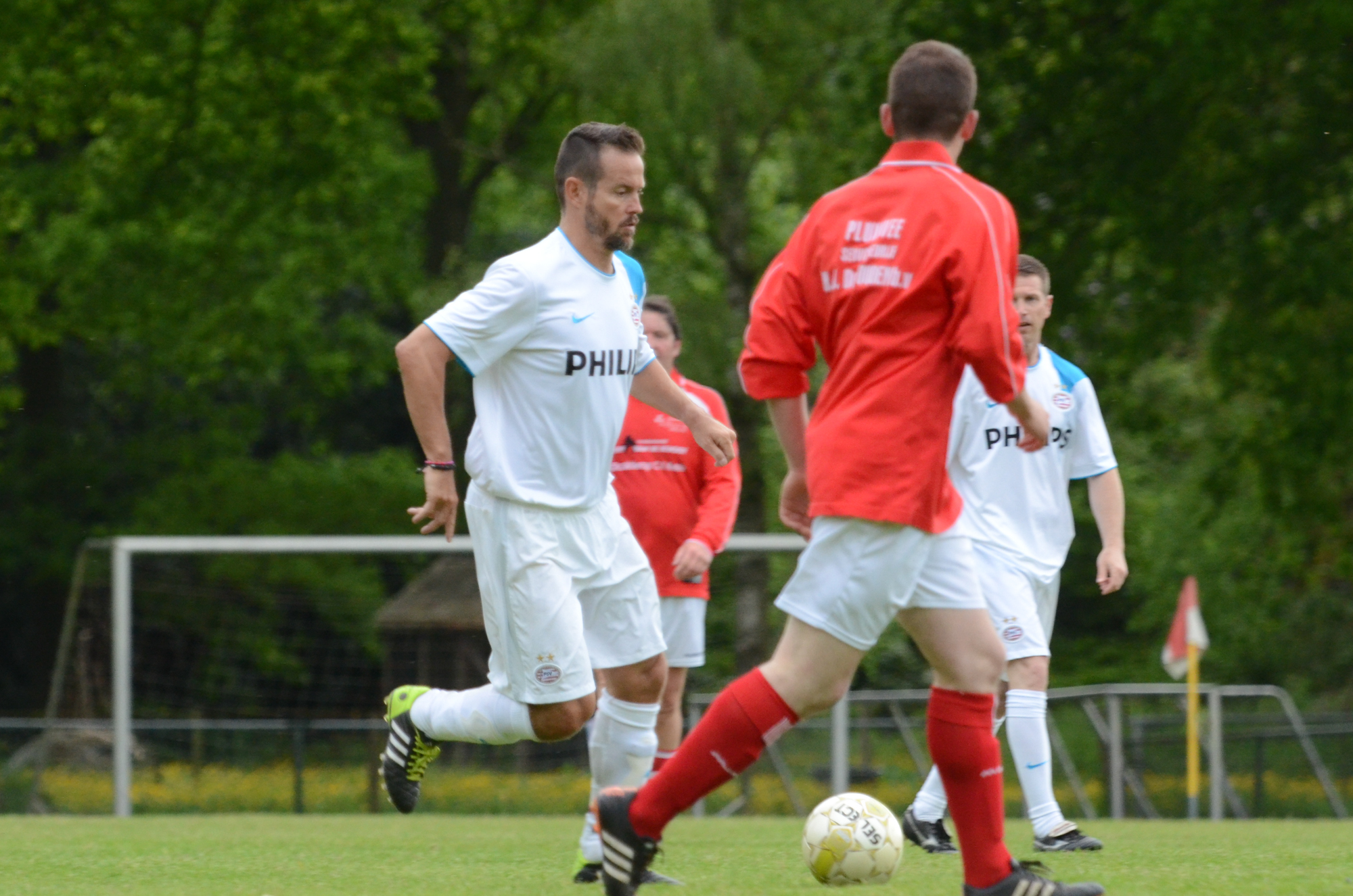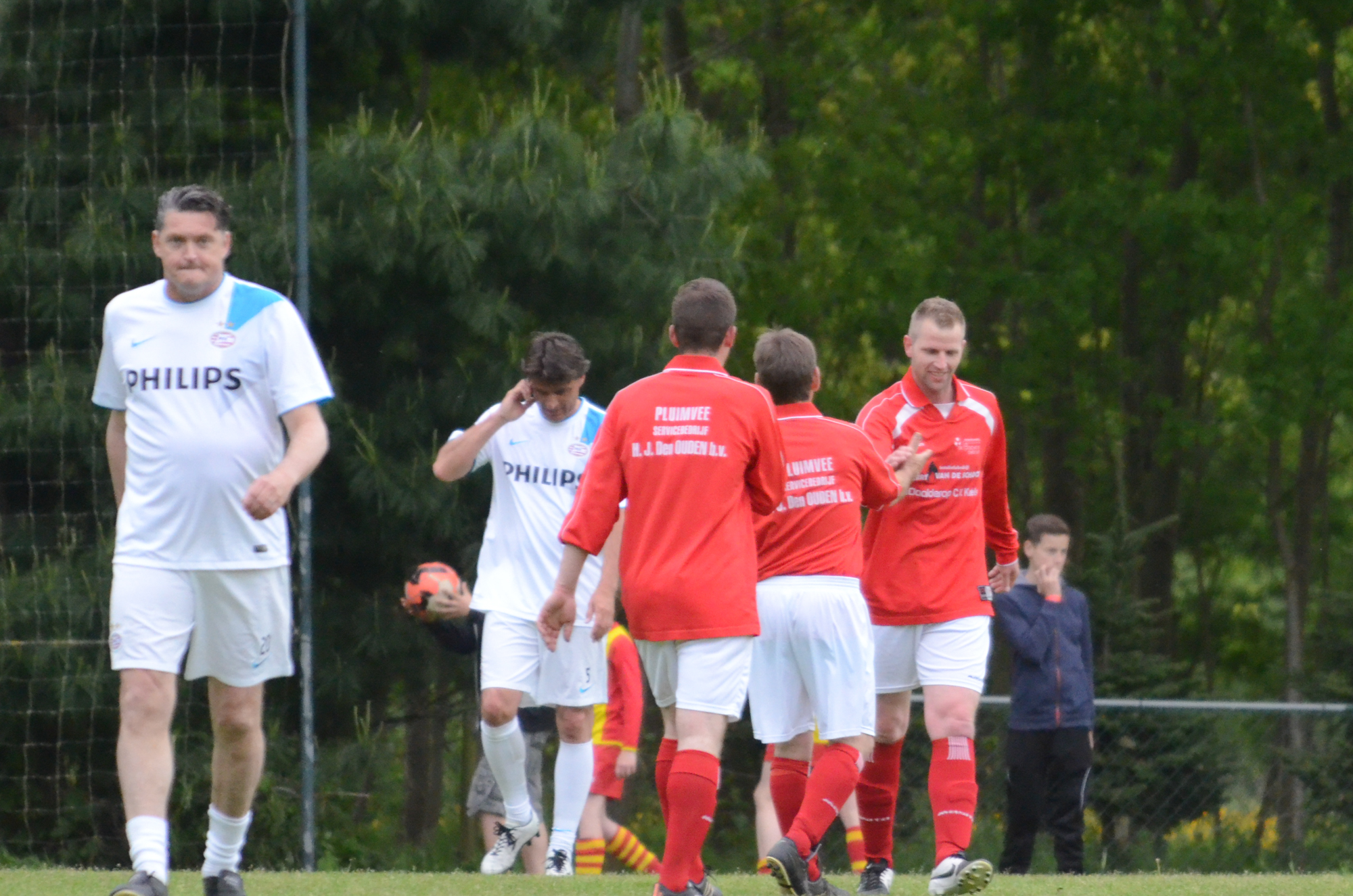 De ‘oudjes’ van PSV hebben op Hemelvaartsdag in de wedstrijd tegen een samengesteld team van de Bocht’80 laten zien nog steeds te beschikken over een fabuleuze baltechniek. Legendary PSV was op volle oorlogssterkte naar sportpark D’n Staak in Oirschot gekomen. Voetballers met een puike staat van dienst: WK finale gespeeld, Europa Cup 1 gewonnen, meerdere landstitels en KNVB bekers, etc. Binnen vijf minuten was het al 0-1 door de opkomende voorstopper Geoffrey Prommayon. Even later verzilverde Arnold Bruggink een penalty. Nadat Ovidiu Stinga met een gekruld schot, dat uiterst precies in de bovenhoek ging, doelman Mark Faes voor een voldongen feit stelde, was de wedstrijd al beslist. Na de thee scoorde Youri Petrov, waarna Ronald Vermaas namens de Bocht’80 de eretreffer 1-4 op het scorebord zetten. Legendary PSV versierde deze mooie voetbalmiddag voor zo’n vijfhonderd bezoekers met een doelpunt van Mart van Duren en het slotakkoord was voor Arnold Bruggink met zijn tweede treffer.