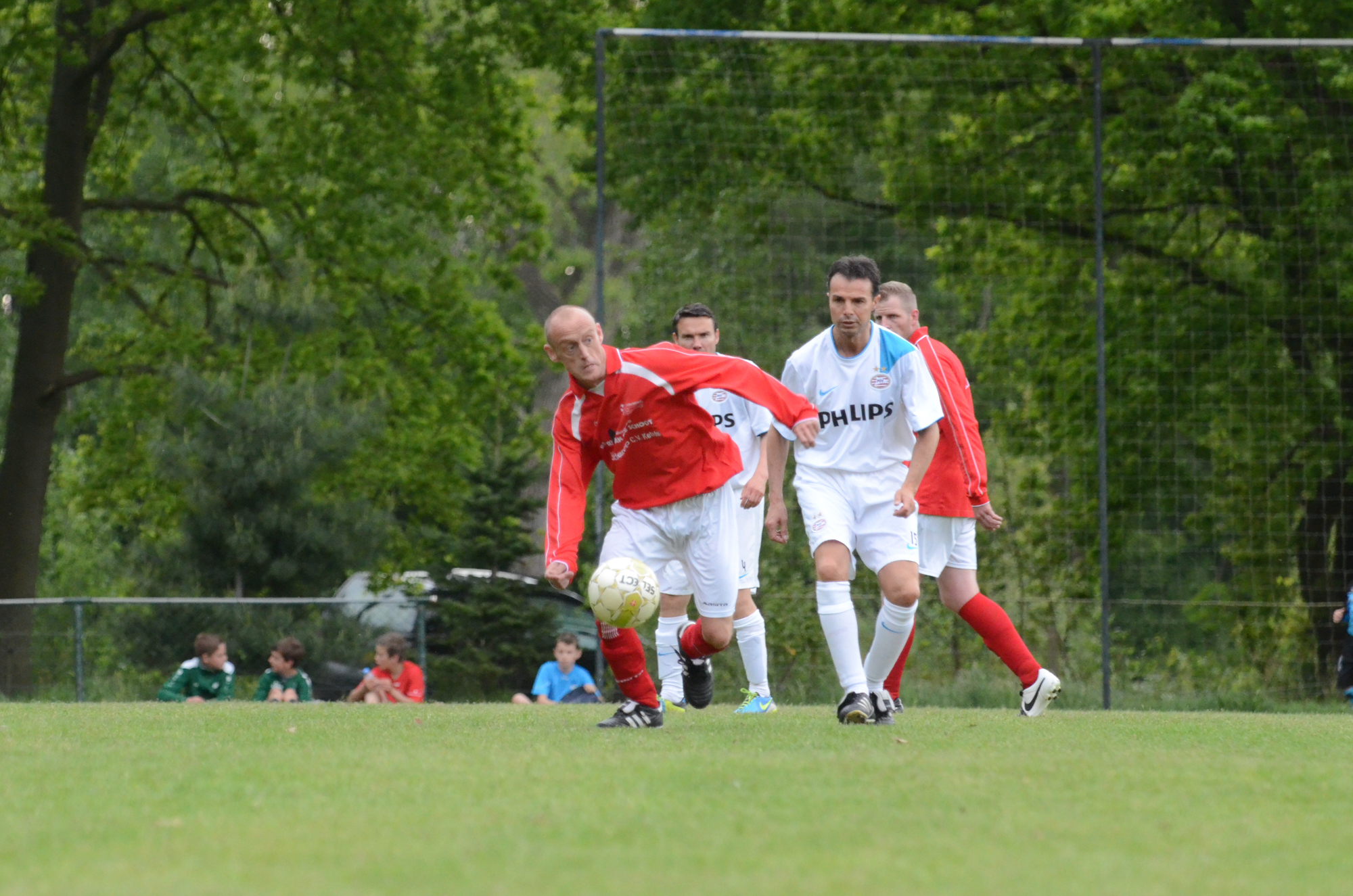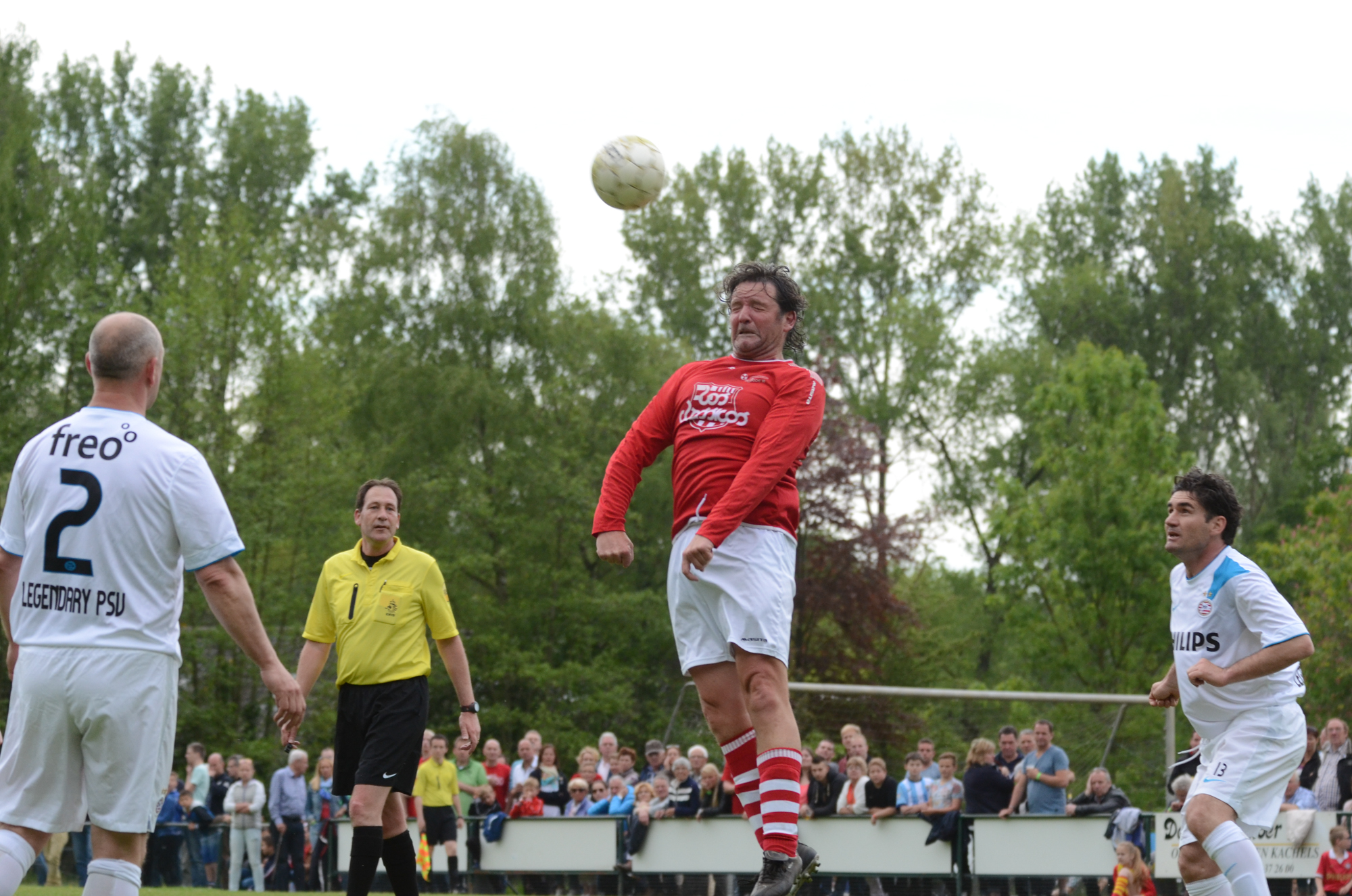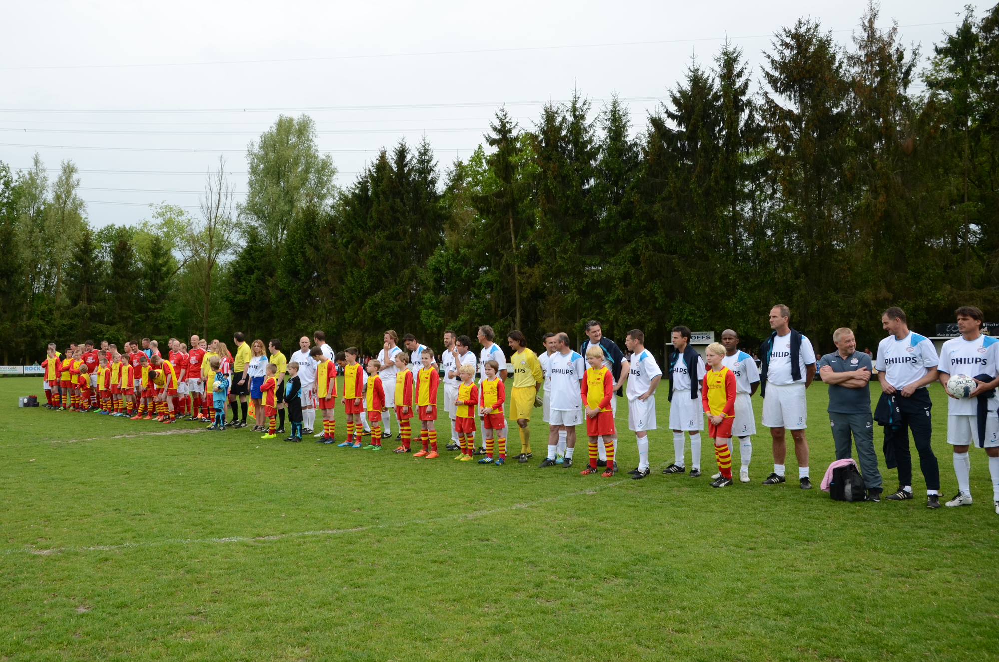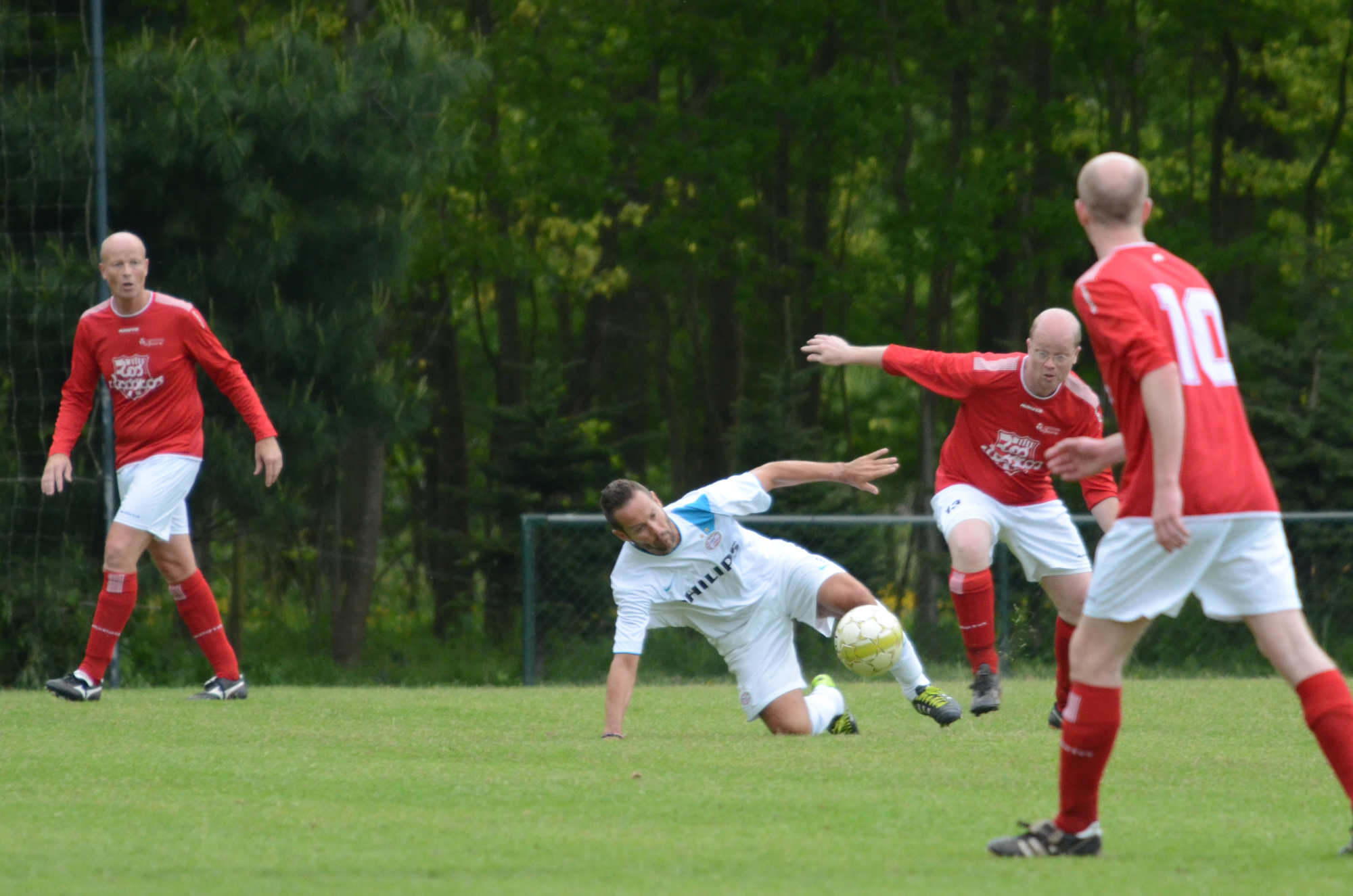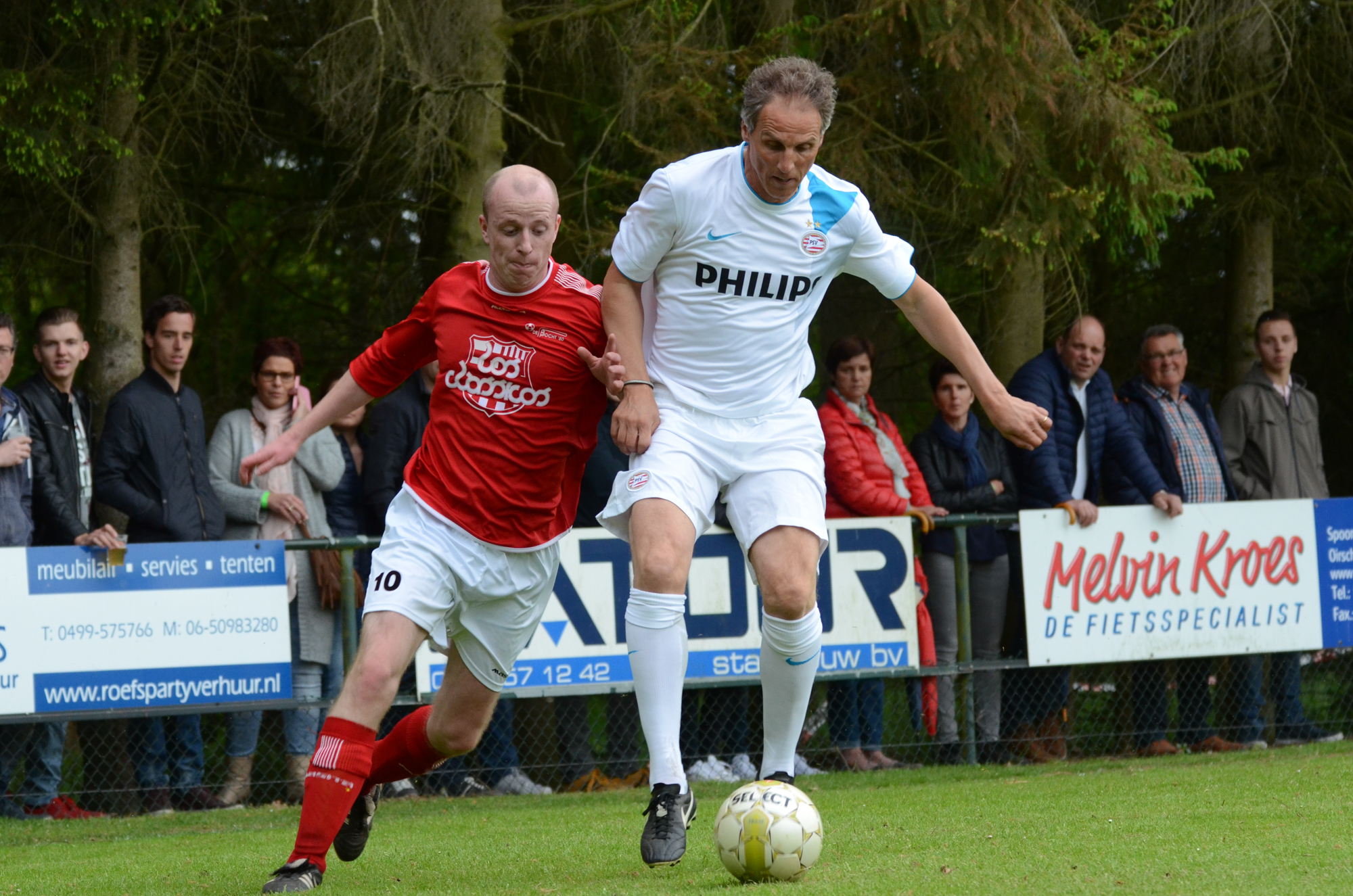 De ‘oudjes’ van PSV hebben op Hemelvaartsdag in de wedstrijd tegen een samengesteld team van de Bocht’80 laten zien nog steeds te beschikken over een fabuleuze baltechniek. Legendary PSV was op volle oorlogssterkte naar sportpark D’n Staak in Oirschot gekomen. Voetballers met een puike staat van dienst: WK finale gespeeld, Europa Cup 1 gewonnen, meerdere landstitels en KNVB bekers, etc. Binnen vijf minuten was het al 0-1 door de opkomende voorstopper Geoffrey Prommayon. Even later verzilverde Arnold Bruggink een penalty. Nadat Ovidiu Stinga met een gekruld schot, dat uiterst precies in de bovenhoek ging, doelman Mark Faes voor een voldongen feit stelde, was de wedstrijd al beslist. Na de thee scoorde Youri Petrov, waarna Ronald Vermaas namens de Bocht’80 de eretreffer 1-4 op het scorebord zetten. Legendary PSV versierde deze mooie voetbalmiddag voor zo’n vijfhonderd bezoekers met een doelpunt van Mart van Duren en het slotakkoord was voor Arnold Bruggink met zijn tweede treffer.