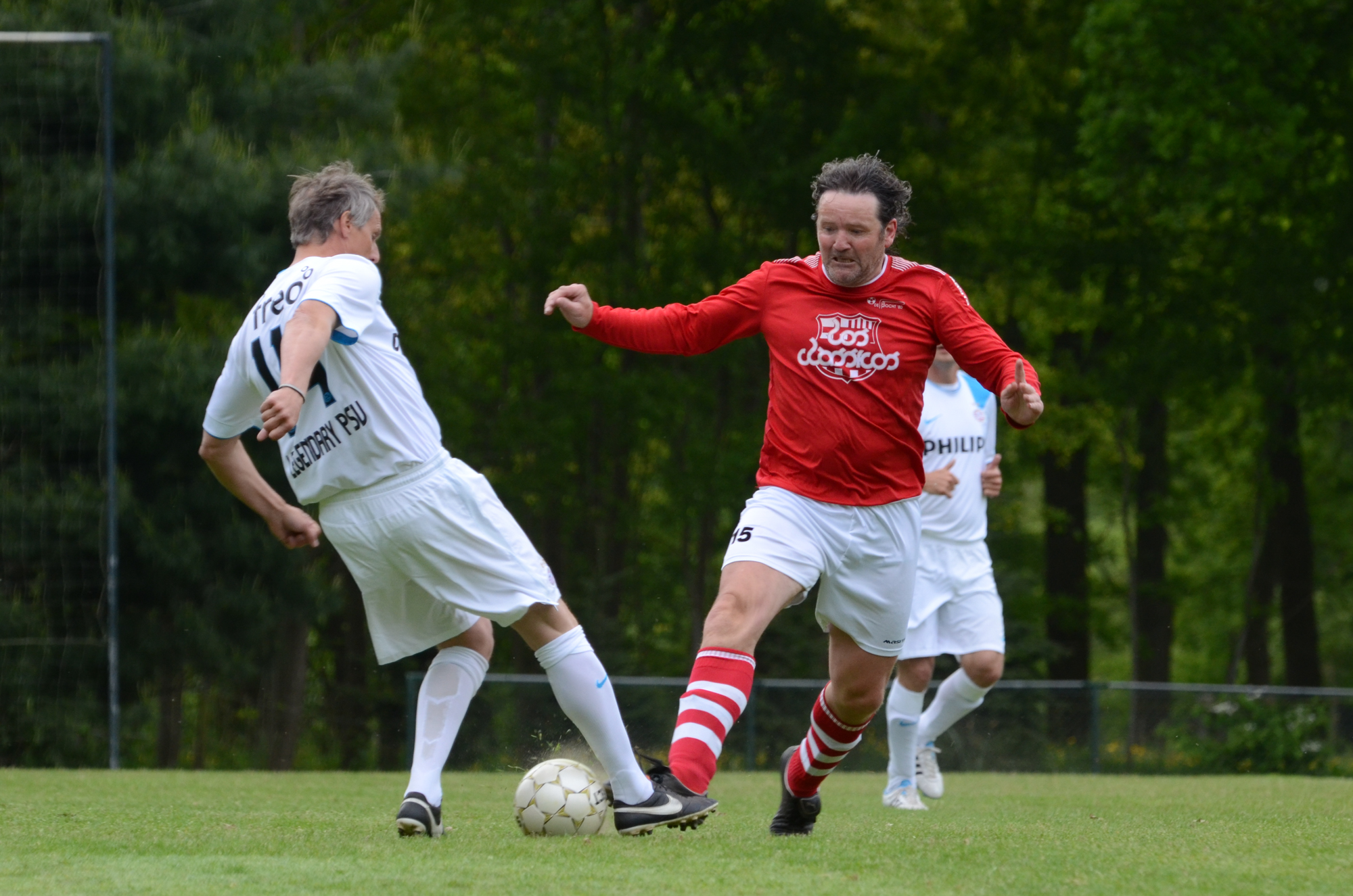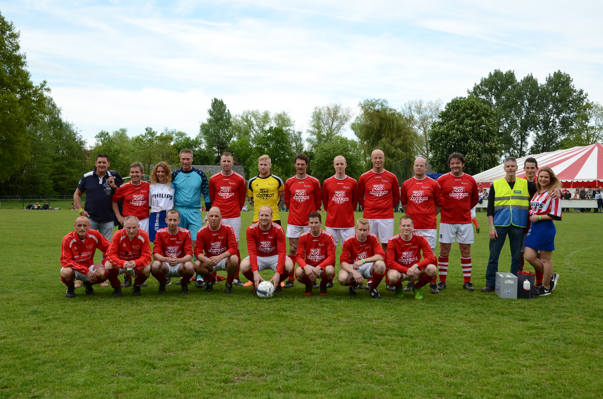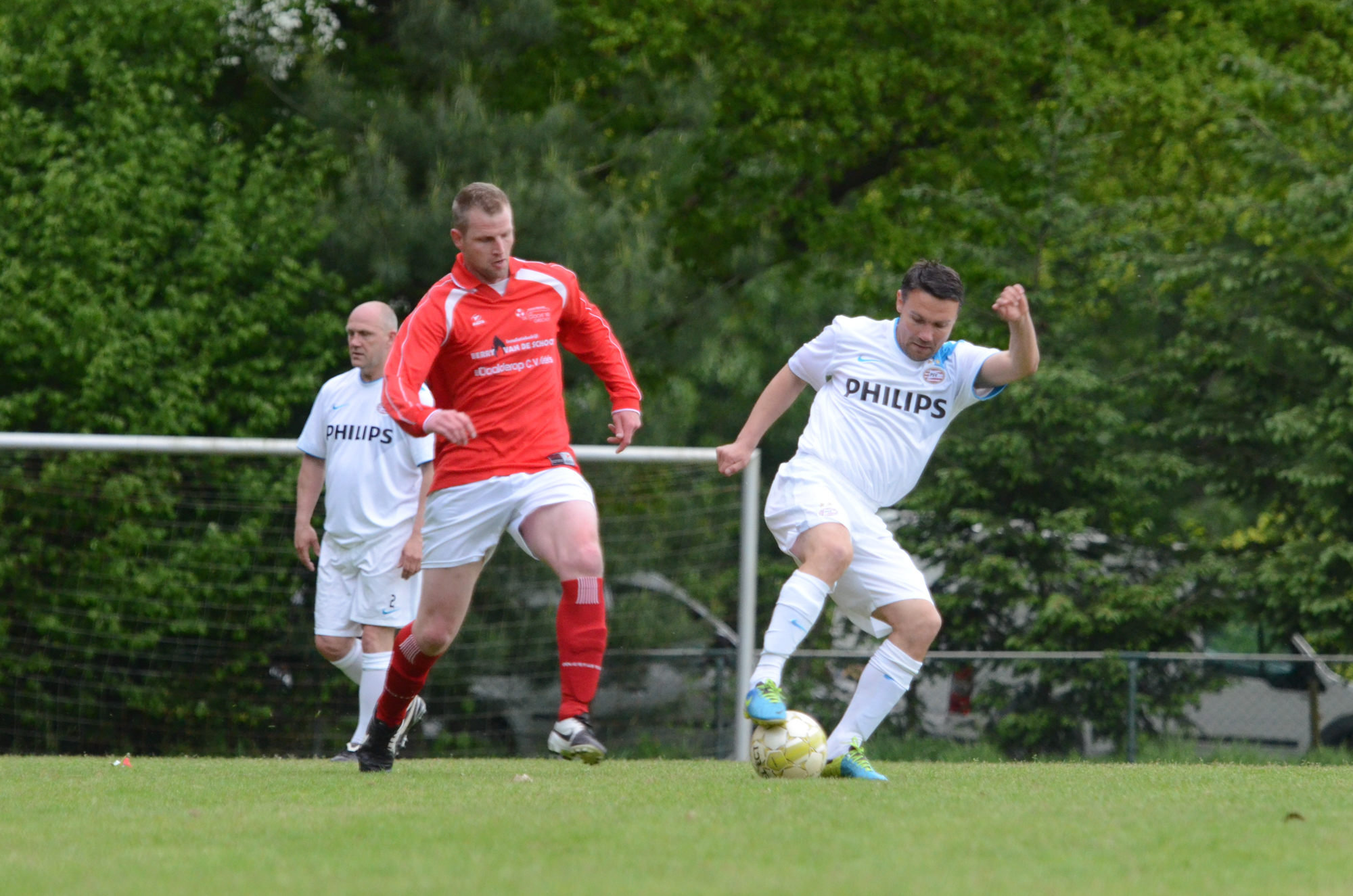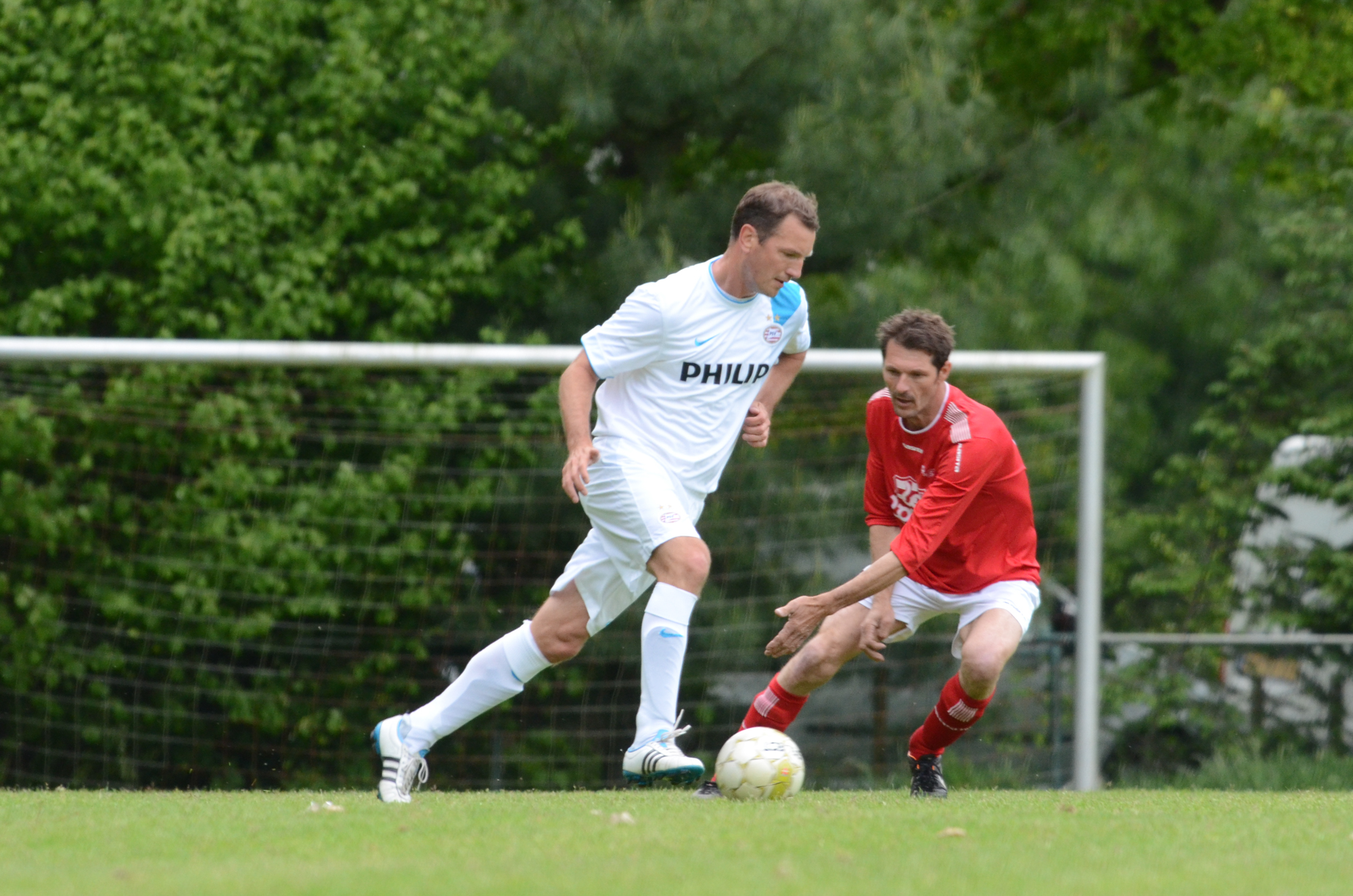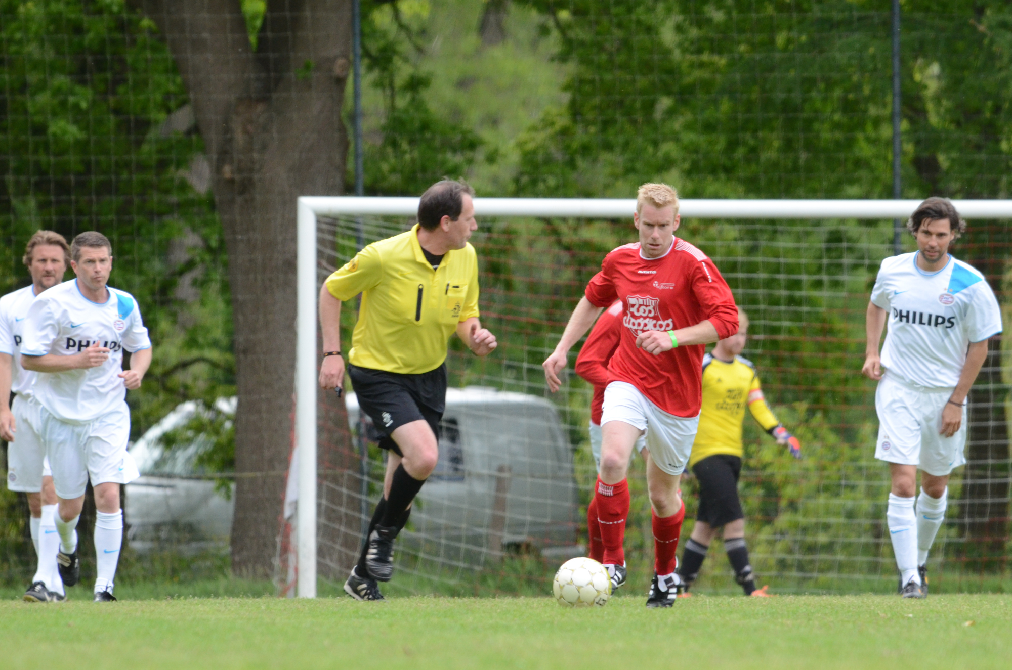 De ‘oudjes’ van PSV hebben op Hemelvaartsdag in de wedstrijd tegen een samengesteld team van de Bocht’80 laten zien nog steeds te beschikken over een fabuleuze baltechniek. Legendary PSV was op volle oorlogssterkte naar sportpark D’n Staak in Oirschot gekomen. Voetballers met een puike staat van dienst: WK finale gespeeld, Europa Cup 1 gewonnen, meerdere landstitels en KNVB bekers, etc. Binnen vijf minuten was het al 0-1 door de opkomende voorstopper Geoffrey Prommayon. Even later verzilverde Arnold Bruggink een penalty. Nadat Ovidiu Stinga met een gekruld schot, dat uiterst precies in de bovenhoek ging, doelman Mark Faes voor een voldongen feit stelde, was de wedstrijd al beslist. Na de thee scoorde Youri Petrov, waarna Ronald Vermaas namens de Bocht’80 de eretreffer 1-4 op het scorebord zetten. Legendary PSV versierde deze mooie voetbalmiddag voor zo’n vijfhonderd bezoekers met een doelpunt van Mart van Duren en het slotakkoord was voor Arnold Bruggink met zijn tweede treffer.