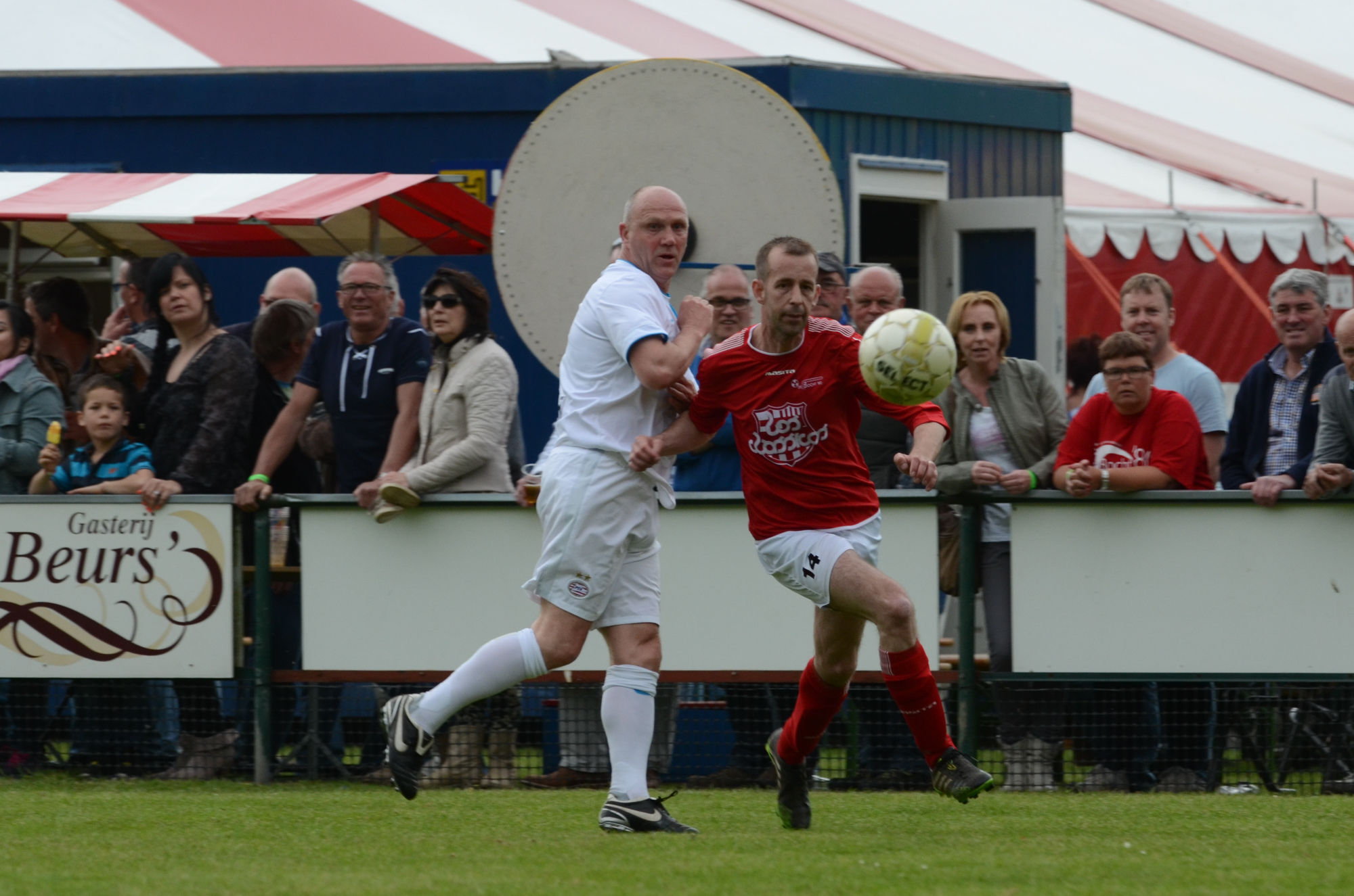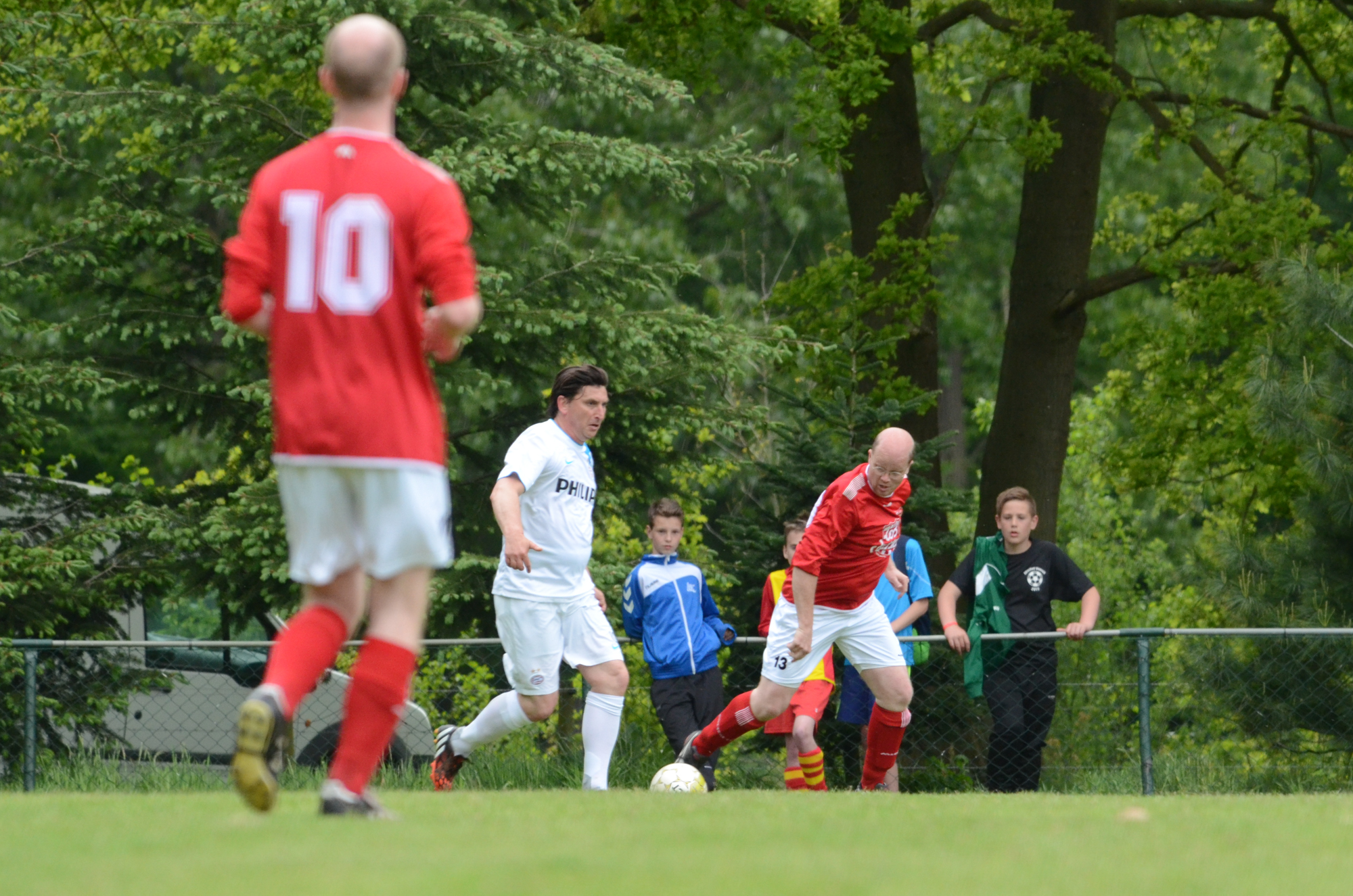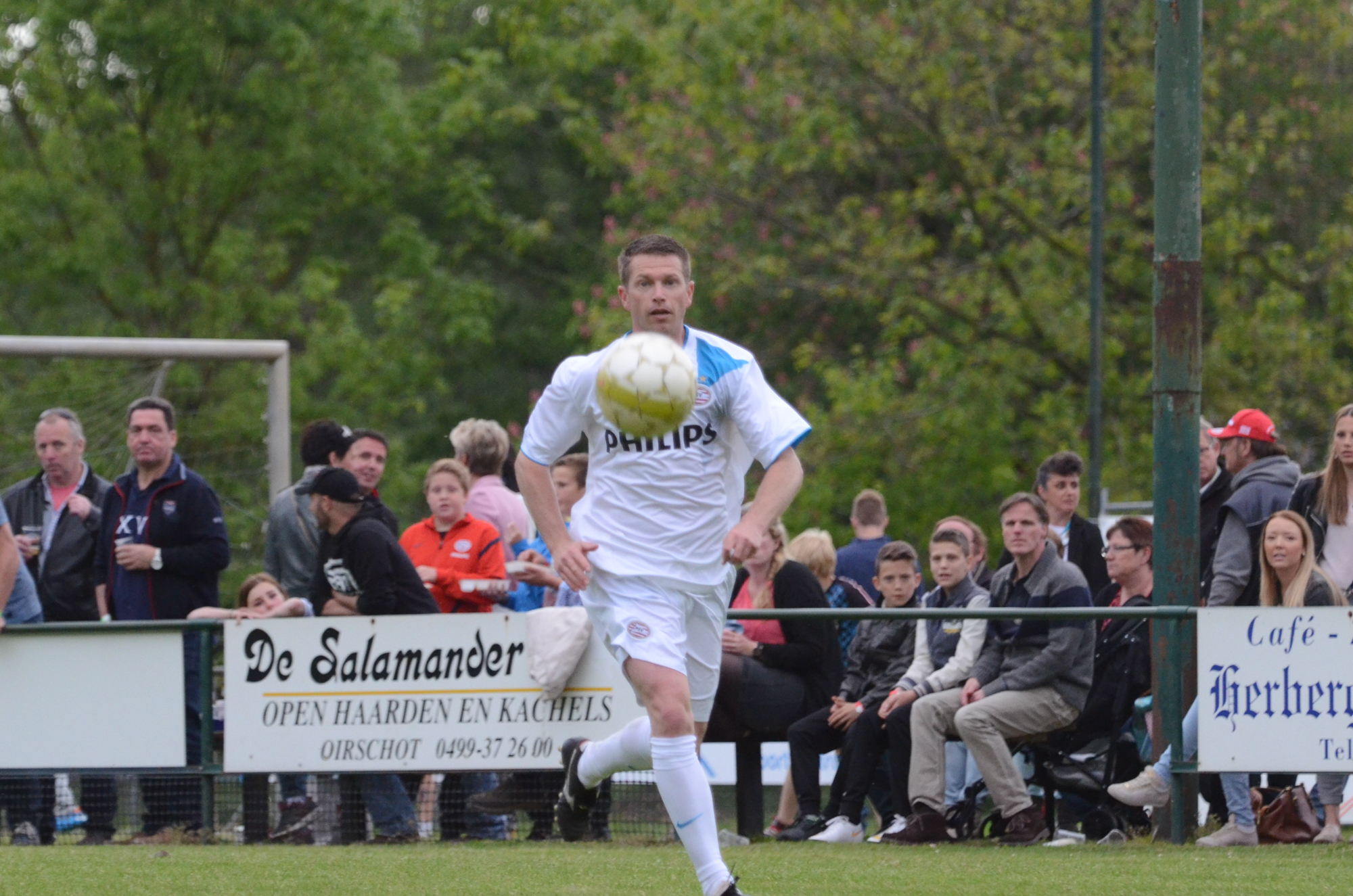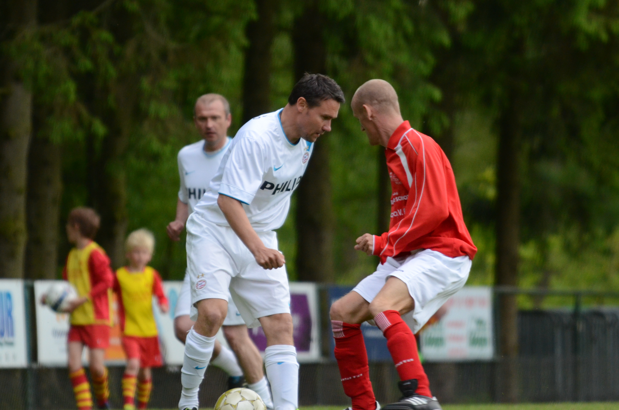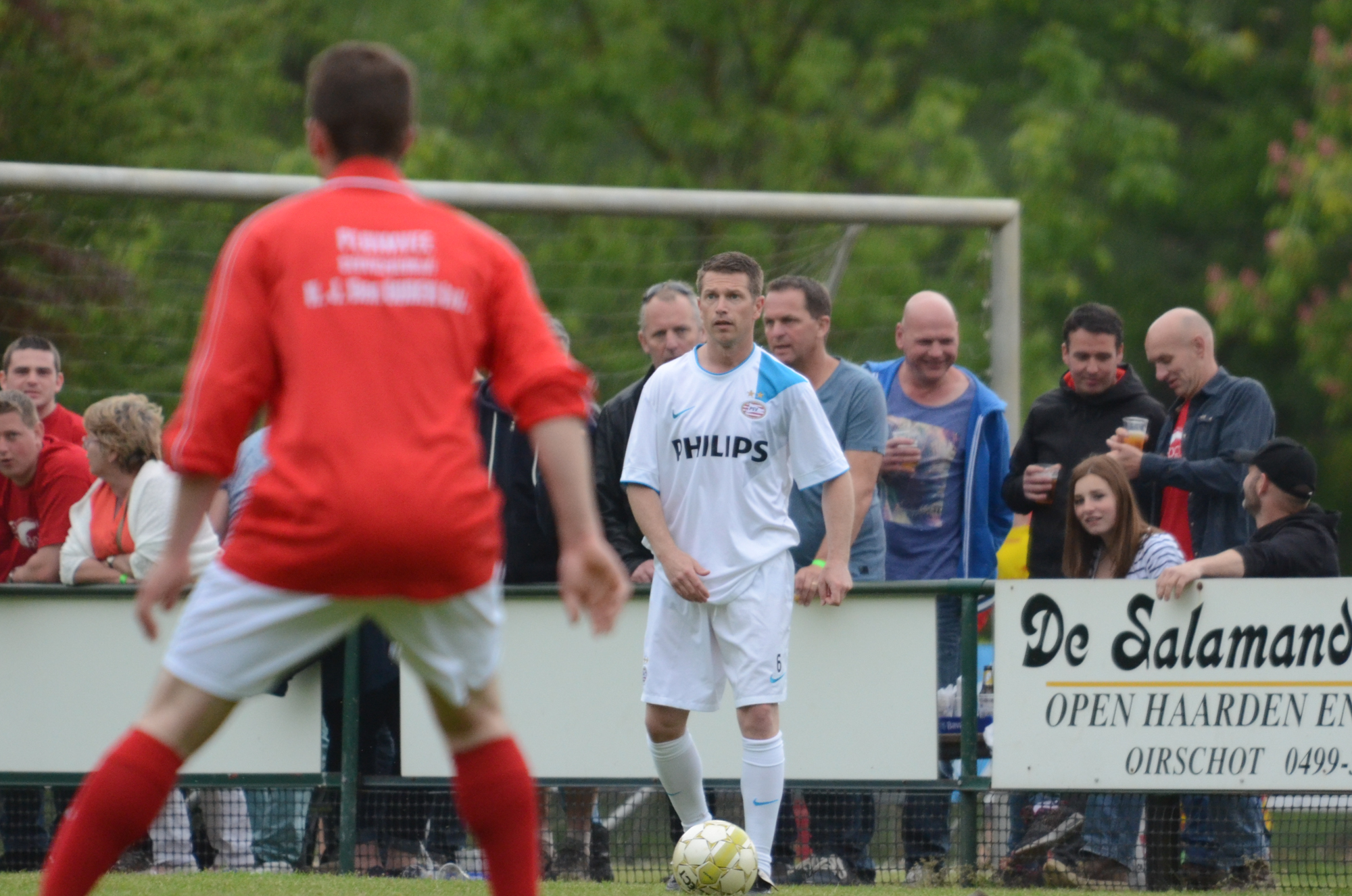 De ‘oudjes’ van PSV hebben op Hemelvaartsdag in de wedstrijd tegen een samengesteld team van de Bocht’80 laten zien nog steeds te beschikken over een fabuleuze baltechniek. Legendary PSV was op volle oorlogssterkte naar sportpark D’n Staak in Oirschot gekomen. Voetballers met een puike staat van dienst: WK finale gespeeld, Europa Cup 1 gewonnen, meerdere landstitels en KNVB bekers, etc. Binnen vijf minuten was het al 0-1 door de opkomende voorstopper Geoffrey Prommayon. Even later verzilverde Arnold Bruggink een penalty. Nadat Ovidiu Stinga met een gekruld schot, dat uiterst precies in de bovenhoek ging, doelman Mark Faes voor een voldongen feit stelde, was de wedstrijd al beslist. Na de thee scoorde Youri Petrov, waarna Ronald Vermaas namens de Bocht’80 de eretreffer 1-4 op het scorebord zetten. Legendary PSV versierde deze mooie voetbalmiddag voor zo’n vijfhonderd bezoekers met een doelpunt van Mart van Duren en het slotakkoord was voor Arnold Bruggink met zijn tweede treffer.