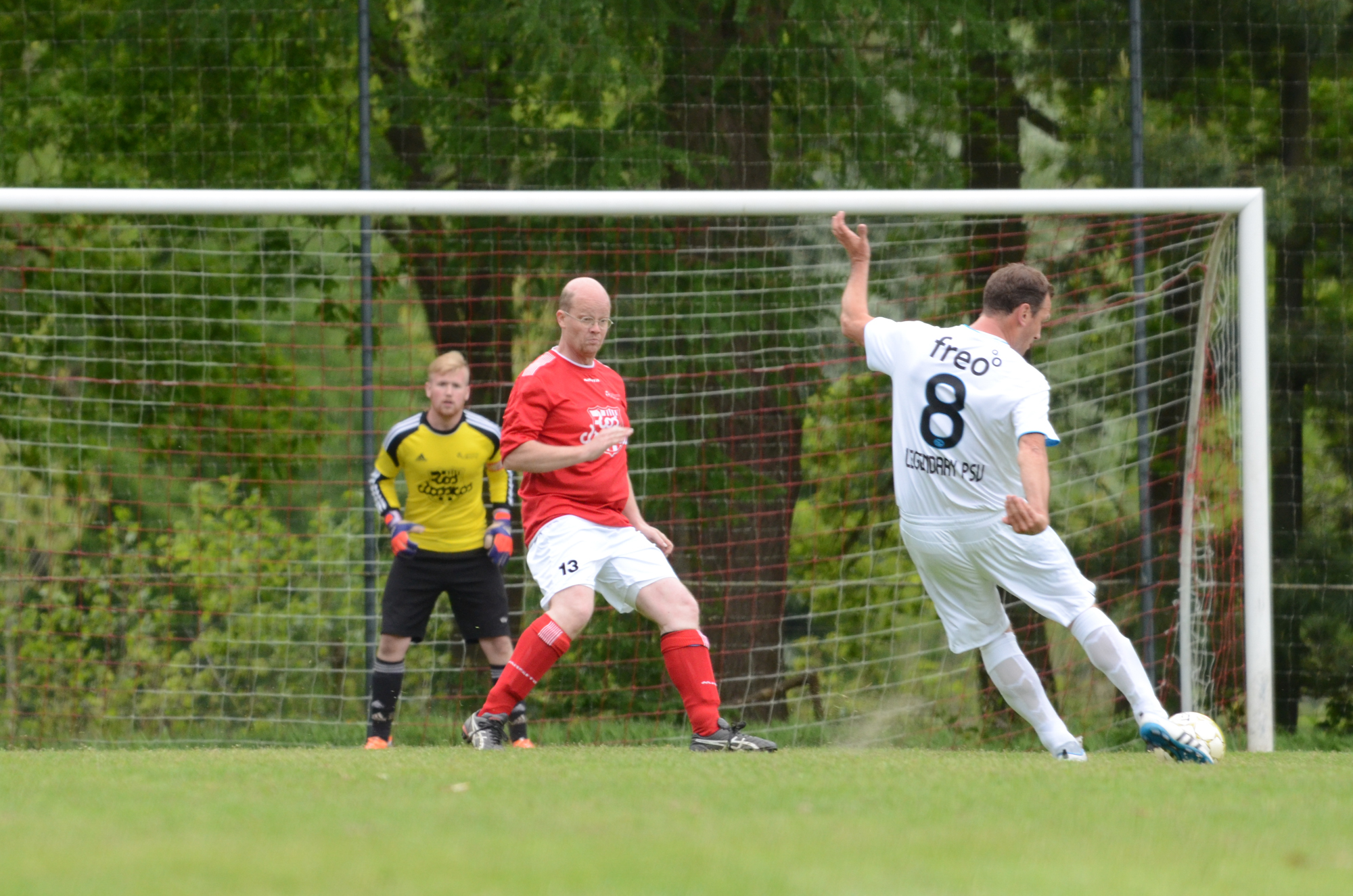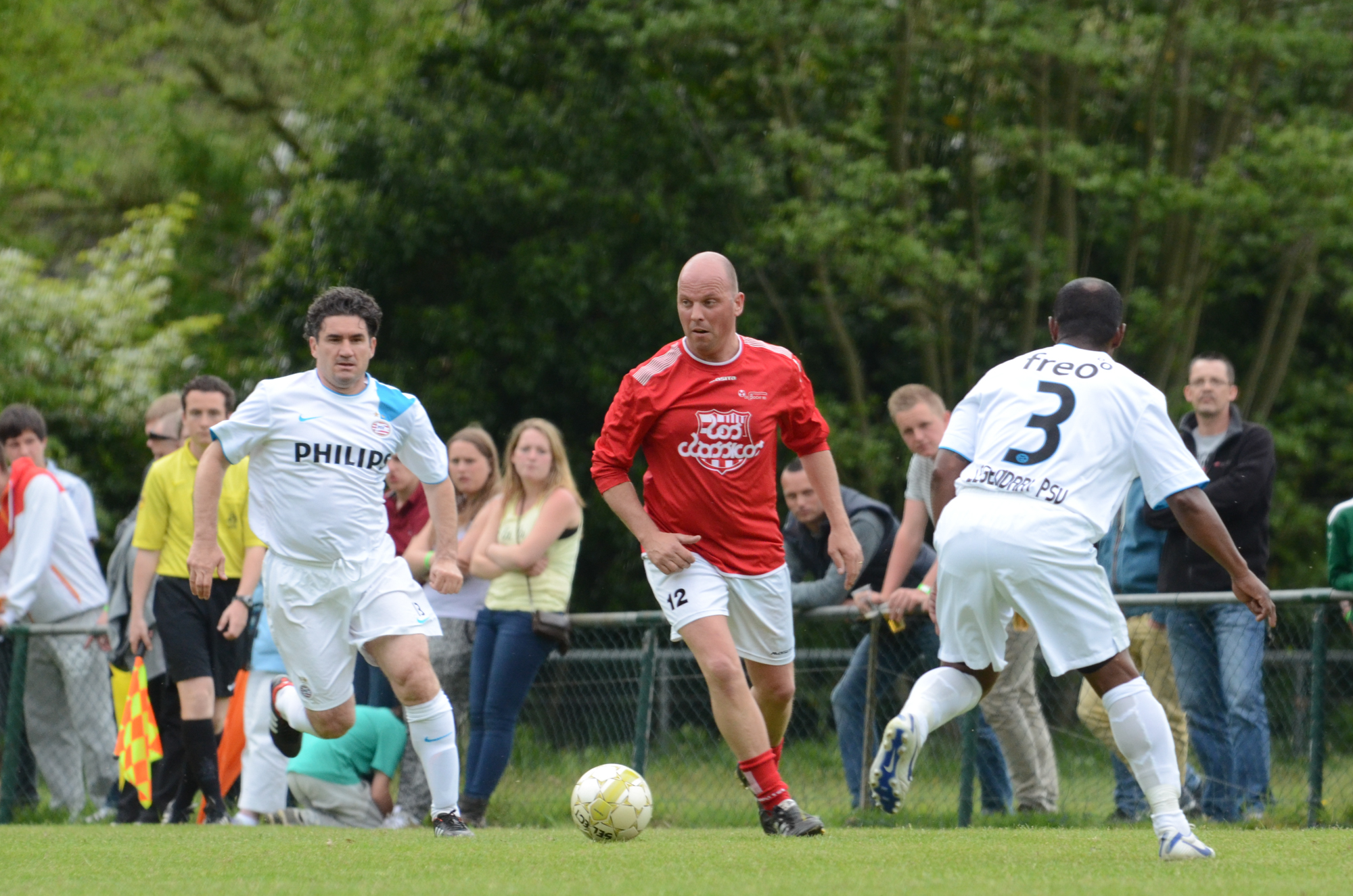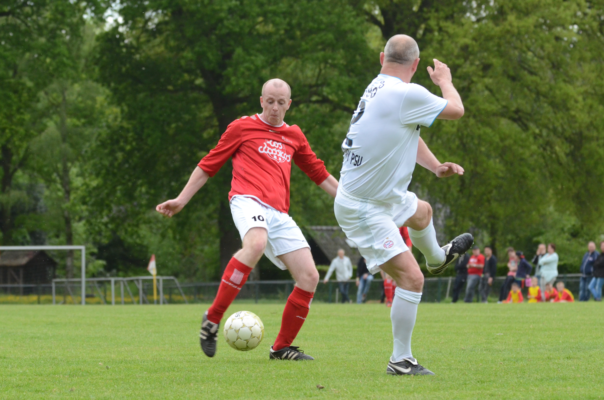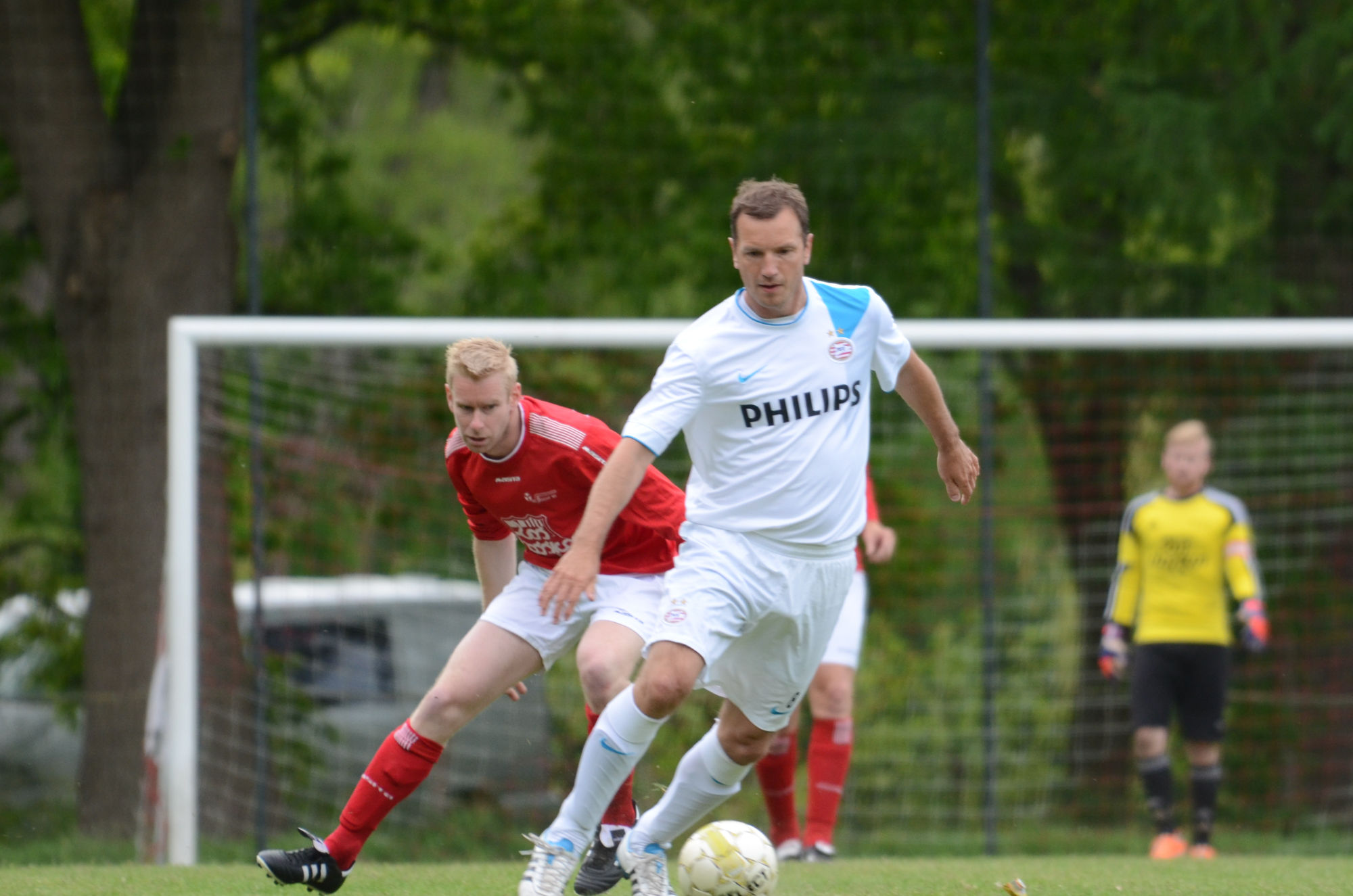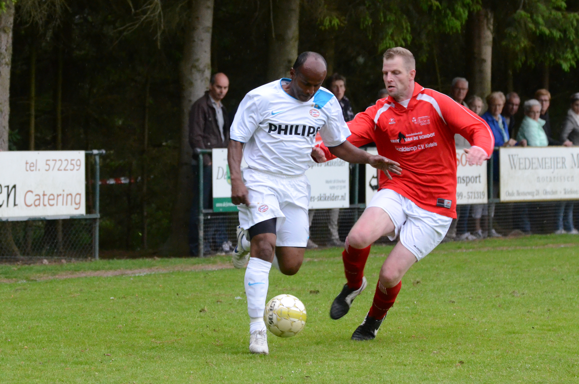 De ‘oudjes’ van PSV hebben op Hemelvaartsdag in de wedstrijd tegen een samengesteld team van de Bocht’80 laten zien nog steeds te beschikken over een fabuleuze baltechniek. Legendary PSV was op volle oorlogssterkte naar sportpark D’n Staak in Oirschot gekomen. Voetballers met een puike staat van dienst: WK finale gespeeld, Europa Cup 1 gewonnen, meerdere landstitels en KNVB bekers, etc. Binnen vijf minuten was het al 0-1 door de opkomende voorstopper Geoffrey Prommayon. Even later verzilverde Arnold Bruggink een penalty. Nadat Ovidiu Stinga met een gekruld schot, dat uiterst precies in de bovenhoek ging, doelman Mark Faes voor een voldongen feit stelde, was de wedstrijd al beslist. Na de thee scoorde Youri Petrov, waarna Ronald Vermaas namens de Bocht’80 de eretreffer 1-4 op het scorebord zetten. Legendary PSV versierde deze mooie voetbalmiddag voor zo’n vijfhonderd bezoekers met een doelpunt van Mart van Duren en het slotakkoord was voor Arnold Bruggink met zijn tweede treffer.